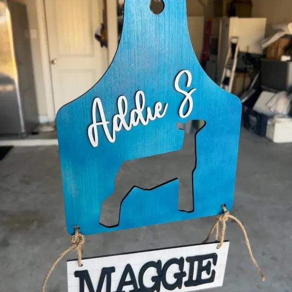 Each sign is shaped like the state of Indiana and is customized with your name, your animal’s name or breed, and optional club or chapter details. Whether you're showing a steer, market goat, lamb, pig, dairy goat, turkey, or chicken, these laser-cut wooden signs make your stall stand out.