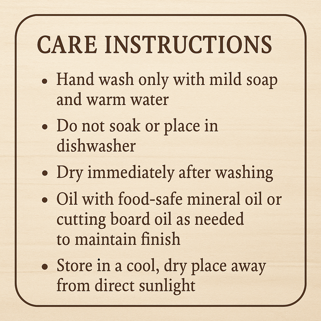Oil with food-safe mineral oil or cutting board oil as needed to maintain finish |